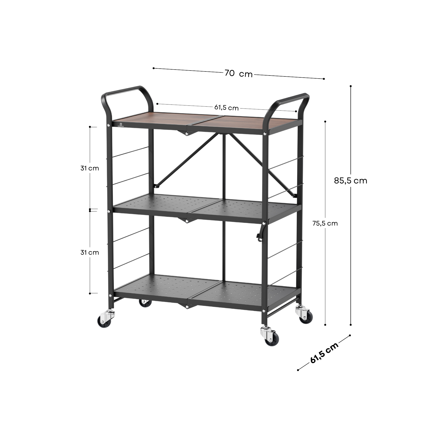 Fabricado en acero pintado de negro, ofrece gran estabilidad y durabilidad. El estante superior con superficie de madera aporta un toque cálido y moderno, combinando funcionalidad y estética.