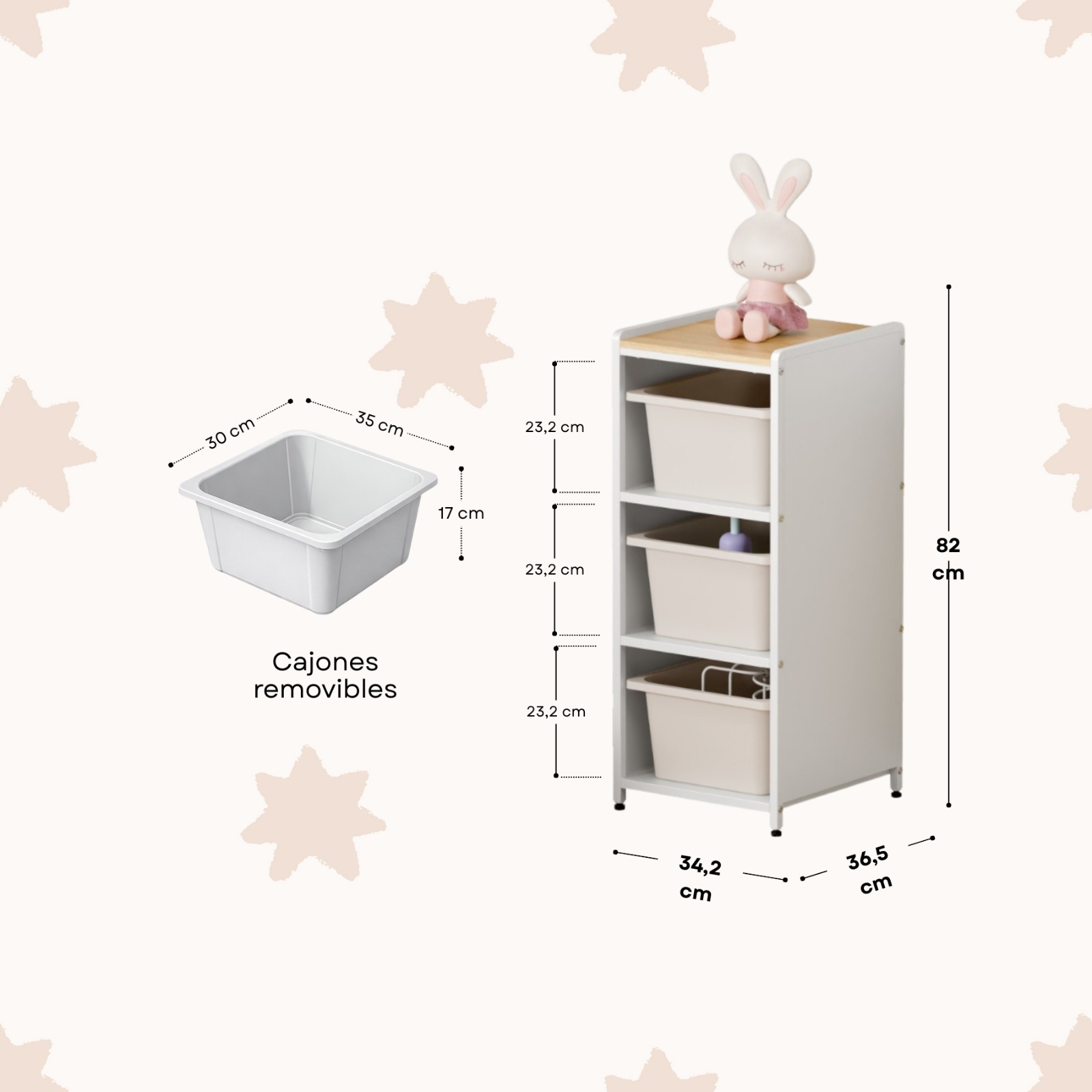 Incluye tres cajones plásticos extraíbles, ideales para guardar juguetes, ropa, pañales, útiles escolares o accesorios. Permiten organizar y limpiar de forma rápida y sencilla.